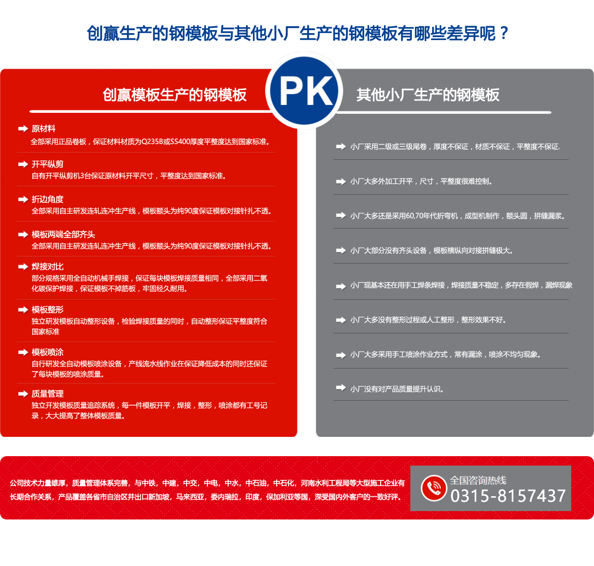 唐山創贏模板有限公司(原唐山豐南雙贏金屬結構廠)始建于一九九七年,是具規模實力的組合模板生產企業,公司自行設計制造的十二條上卷,連軋,連沖,整形,機械人焊接,調直,噴漆,打包鋼模板生產,實現了自動化一條龍生產,品質優,效率高,規格型號為:寬度100-1200mm, 長度300-3000mm, 板厚1.8-4.0mm。 年產量可達200萬平方米,公司創新研制的輕型鋼框組合快拆鋼模板體系,是傳統組合小鋼模升級換代產品,可滿足房建,地下管廊,涵洞,公路,鐵路及各類施工企業的需要,輕型鋼框組合快拆鋼模板體系介紹及應用,已在2017年《施工技術》雜志及《模板腳手架行業協會》雜志發表,詳情請查閱公司網站。 公司生產的噴漆鋼跳板,鍍鋅鋼跳板,采用連軋一次沖孔,承載力大,孔距均勻,外形美觀,年產量可達50萬塊,公司獨創的C型鋼生產線,以其產量高,強度大,成本低,交活迅速,在同行業占有較大優勢,可與C型鋼廠家及各類施工企業合作共贏.